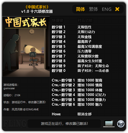 1. “无限悟性”、“无限行动力”、“无限金钱”、“最高面子”、“最高父母满意度”、“压力清零”、“增加 1000 xxx”等功能在数据更新时生效。2. 注意有些事件(比如做试卷)需要把行动力消耗光才能继续,因此需要暂时取消“无限行动力”功能。