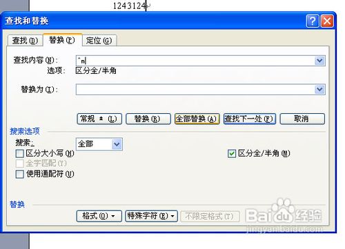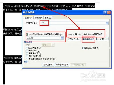 4、然后在查找内容中输入^?,这个是查找任意字符的意思,勾选在主文档中查找,然后点击查找全部,查找窗口就会显示word找到多少个与条件匹配的项,那个数字就是字数了。