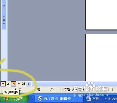 6、先显示分页符,即在word的左下角调整到“普通视图”状态,这时分页符就出现了,直接删除即可。