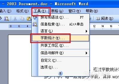 1、如果你要知道整篇word文档有多少字,那么打开word文档后,选择工具菜单下的字数统计,就会弹出整篇文档的字数统计信息了。