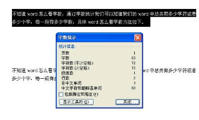 2、如果你只想知道一段的字数,那么可以先选择那一段,然后在选择工具菜单下的字数统计,那么出来的字数统计窗口显示的就是那一段的字数了。