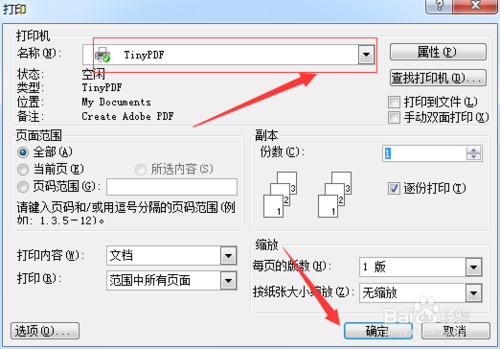 3、在弹出打印选项框中,在打印机位置的名称选择为“TinyPDF”选项功能。
