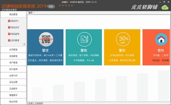 店铺电脑收银系统2019采用了增强的统计报表功能,会员积分管理以及一系列操作细节的优化,是一套突出便捷易用性的店铺收银管理软件。由前台收银及后 台管理两大功能模块组成,支持条码扫描枪、钱箱、pos58小票打印机、顾客显示屏。适合在中小超市或服装店、婴幼儿用品店、玩具店、化妆品店、饰品专卖 店、电器、文具图书、通讯器材店等单机使用。集成了条形码标签打印功能,对于无条码的商品同样可自行贴上条码标签录入到本系统中销售。本系统配合普通电脑 即可安装使用,比专业pos机管理更方便灵活,成本更低。系统初始密码为123,不需要复杂设置,安装后即可使用。【功能介绍】