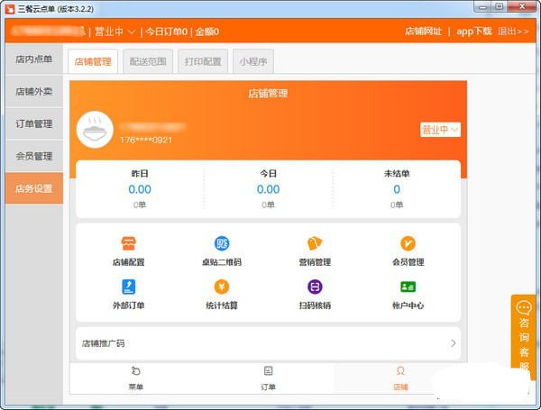 可对接公众号,支持首单、满减等多种 店铺营销方案;支持发放代金券、支持 线上会员充值