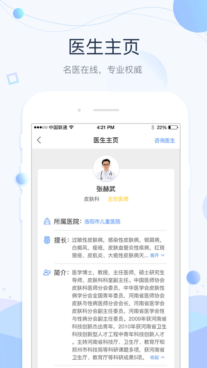 【在线咨询】查评价看回复选专家,专家一对一在线咨询,图文、电话、视频形式任选;【健康档案】在线记录、查询自己、家人的身体指标、健康指数、诊疗记录,家庭健康档案,守护健康,守护家人;