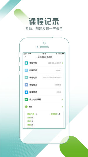 1.班级查看:班级动态,随时掌控,即可查看班级课程,又可查看班级课程的考勤,还可以对班级的考勤状况进行统计2.课程管理:班主任按照班级查看课程,授课老师可按照日期查看自己所授课的课表