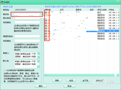 在创建群的界面,输入群名称,以及一些基本的内容,还有勾选这个群的成员,都完成后,点击确定。密码可设也可不设。