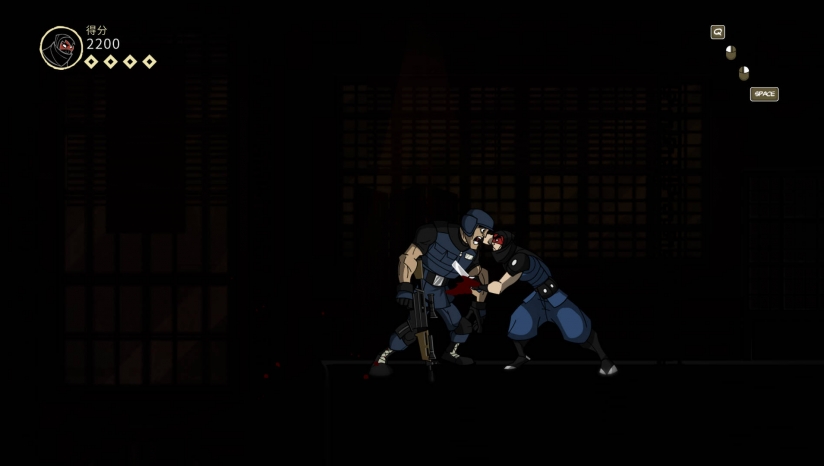 界面介绍:左上角人物头像。灯光下背景是白的 如图,而在黑暗中则变为黑色。旁边是分数,当你成功躲过或击杀敌人时,会有分数的累加。右上角基本的操作提示,具体选项菜单里可以查询和设置。