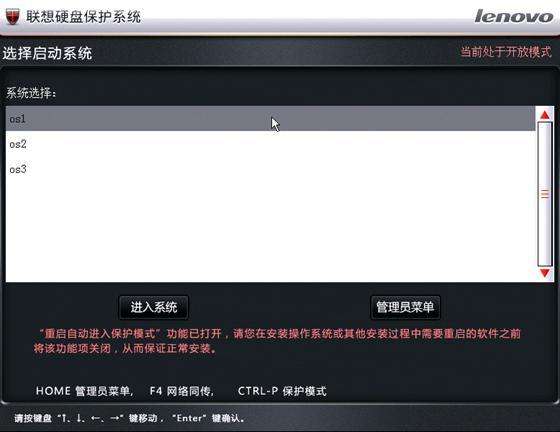 1、保护模式向开放模式切换,在开机出现联想硬盘保护系统-选择启动系统界面,按CTRL+O,进入开放模式,如图: