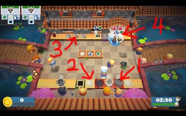 这一关较复杂,因为食材位置较刁钻,所以,笔者建议在如下图区域1和区域2,分别安排一个厨师,区域1专门负责切菜,区域2专门负责煮饭。