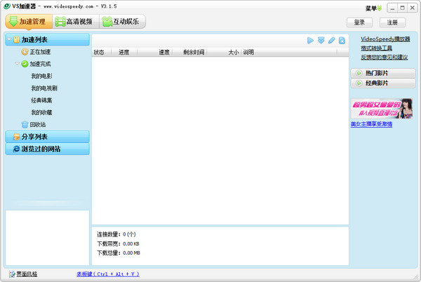 VideoSpeedy简称VS加速器是一款永久免费的视频加速软件。在线观看视频时,通过它加速后能够提高视频流的下载速度,消除画面的停顿,让您拥有真正流畅的视频体验。VS加速器采用众多先进的技术,如点对点传输(P2P)、多任务下载、分块Cache等技术,为视频网站提供视频点播的加速服务,目的是为视频网站运营商减轻服务器压力、节省带宽、减低运营成本,让用户在线收看视频更流畅。
