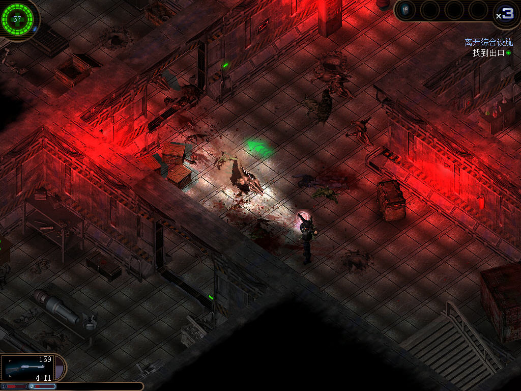 然后回到大厅,将金鱼放到大厅中间的水洞里,然后你就能操纵金鱼在下水道中去打开隔间的开关了。鼠标操纵方向,左右键是控制鱼加速,但是加速后会有一小段的休息时间。注意在水中要小心刺球和那条大鱼。隔间打开后消灭房间中的敌人(要先消灭掉中间生产异型的母巢)。坐电梯到上面的房间,消灭掉大异型。