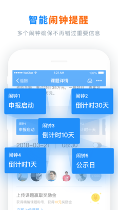 - 汇总全国各大学术活动信息:课题申报、学术会议、学科竞赛;- 智能闹铃,多段提醒,持续跟踪课题、会议和竞赛;