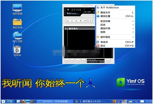 打开开始菜单,在“影音”子菜单中我们看到了雨林木风在系统特征中提到的 Audacious,这个软件在2.X之后就一直对中文不敏感,界面除了首选项之外全是英文,雨林木风加强版会是什么样子呢?打开看看。