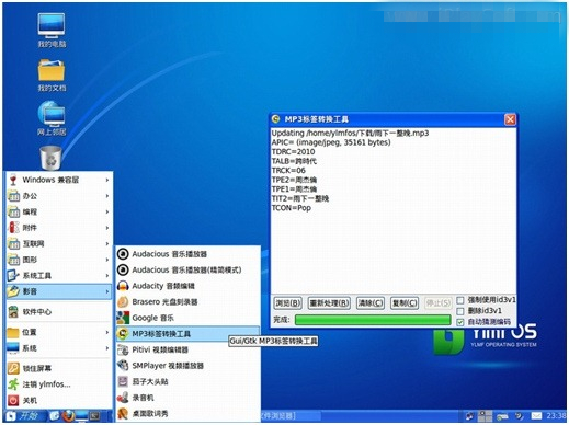 Audacious,这个号称Linux下的千千静听,操作界面已经完全中文化,还有屏幕背景歌词。在打开“影音”子菜单的时候还看到一个东西,“MP3标签转换工具”。大家知道,在Linux环境下,很多网络上下载的MP3文件添加到播放 软 件的列表中会出现乱码,这是Windows环境跟Linux环境下编码不同造成的结果,以前都是用命令行来转换,现在雨林木风开发了一款图形化的软件,总 算是解决了这一难题。