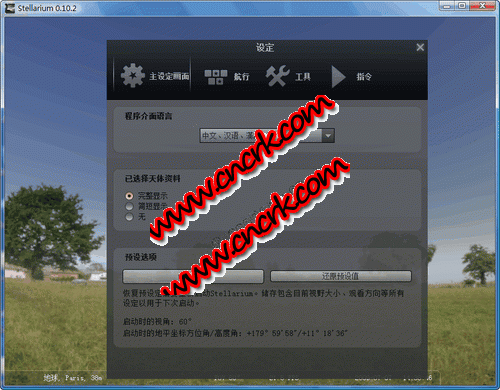 Stellarium Portable V0.11.3 多国语言绿色便携版 stellarium是一个免费开源的桌面虚拟天文馆软件,可在linux/unix, windows and macosx平台上运行.它使用opengl对星空进行实时渲染,在你的电脑桌面上生成一片虚拟3d天空,因此星空效果和你用肉眼,望远镜或者天文望远镜观察到的星空别无二致.stellarium也有白天和黑夜变化,你可以通过调整日期或时间,来看到不同季节的天空.