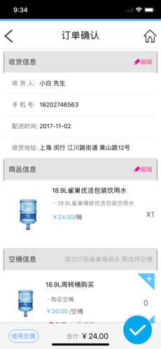周全的送货地址: 为父母家订水、为公司订水,每个用户可设置两个家庭地址、一个公司地址,让大家一起健康饮水。