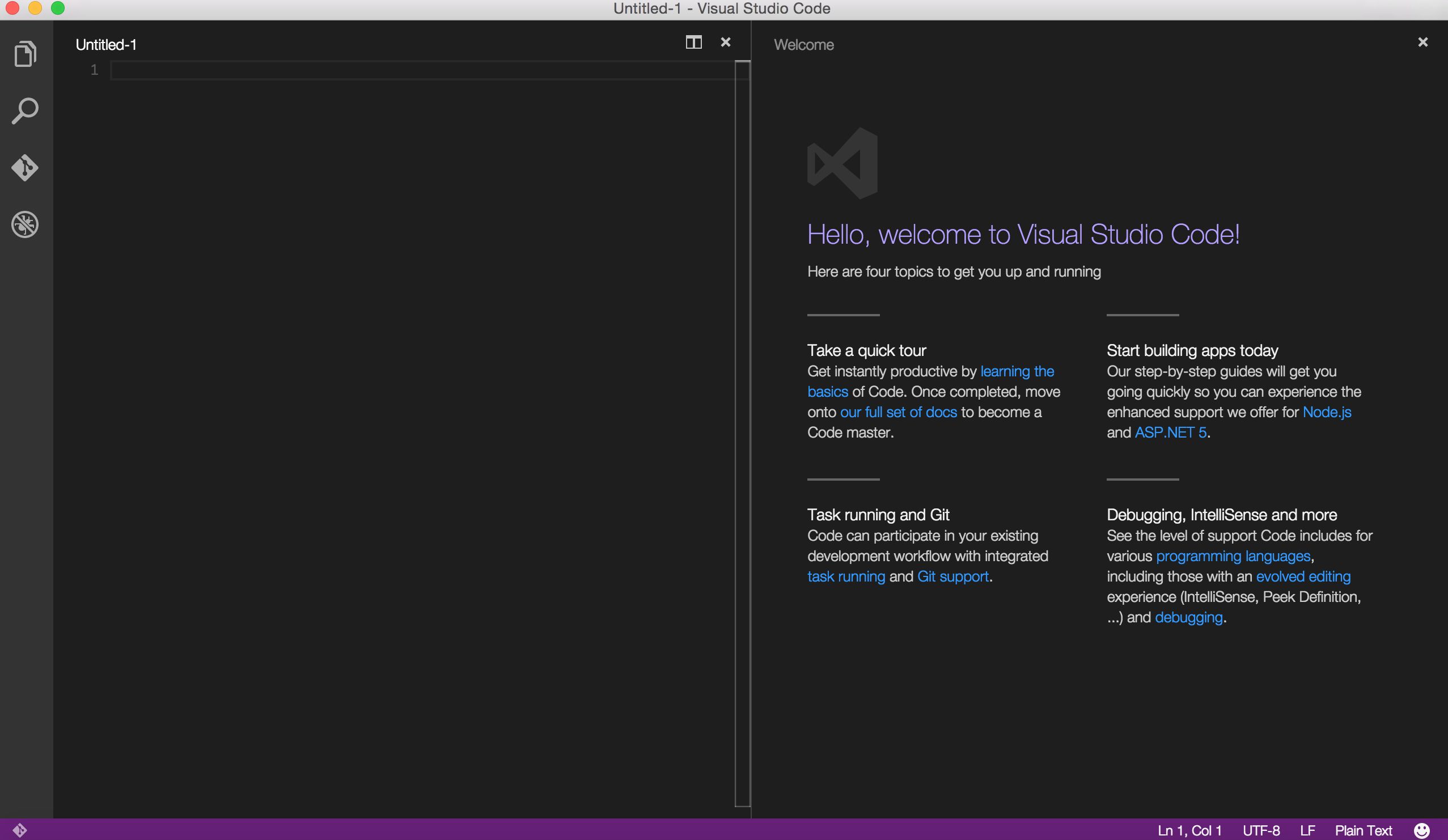 安装结束之后会默认打开VSCode,打开的VSCode软件界面如下图所示: