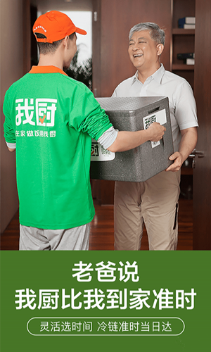 我厨自建全城冷链物流体系,自建几百人的配送团队,一日三送,全年无休,准时递送新鲜。