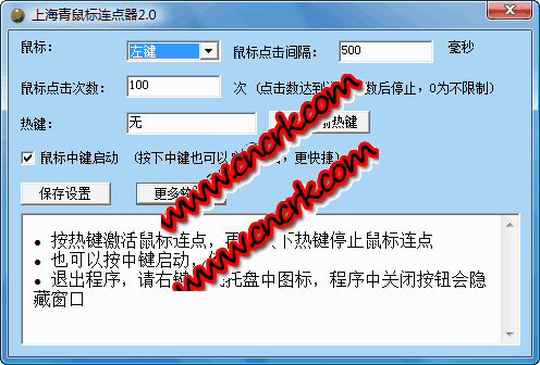 上海青鼠标连点器可以自由设置单击鼠标间隔时间及单击方式(左键、右键),只需要将鼠标移动到需要连点的地方,然后按相应热键就可以启动连点了,再按下相应热键停止。特色之处,还可以通过中键启动点击 特色之处,还可以通过中键启动点击