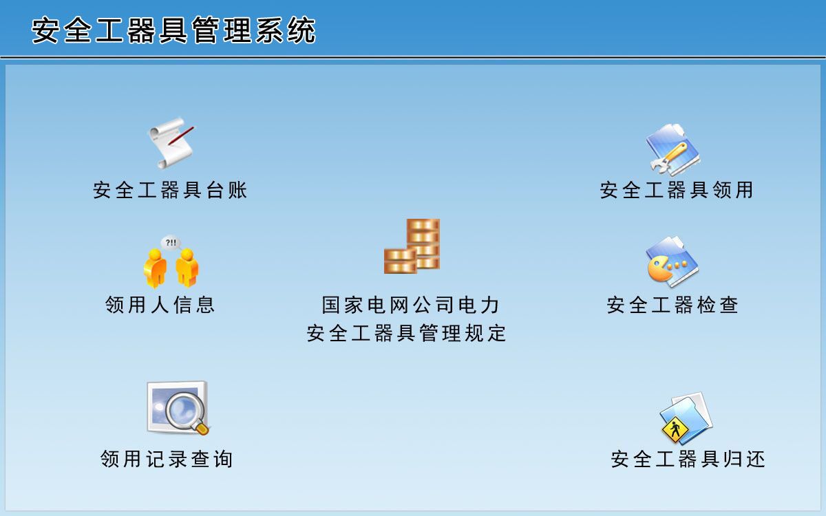 由于电力安全工具的库存管理不同于一般的普通商品,在使用及管理上均具有特殊要求,例如,必须快速响应突发事件,并严格保证安全性和时效性,采用传统的管理方式,需要过多的人工参与,效率低下、容易出错,且审计和风险管理都靠人为处理,无法满足安全工具仓库管理的安全性、可靠性、时效性以及可控性的切实管理要求,所以我们开发了这款《安全工器具管理系统》。 系统包含: 1、基本信息:安全工器具台账、领用人信息 2、信息管理:安全工器具领用、安全工器具检查、安全工器具归还、管理规定 3、统计查询:领用查询