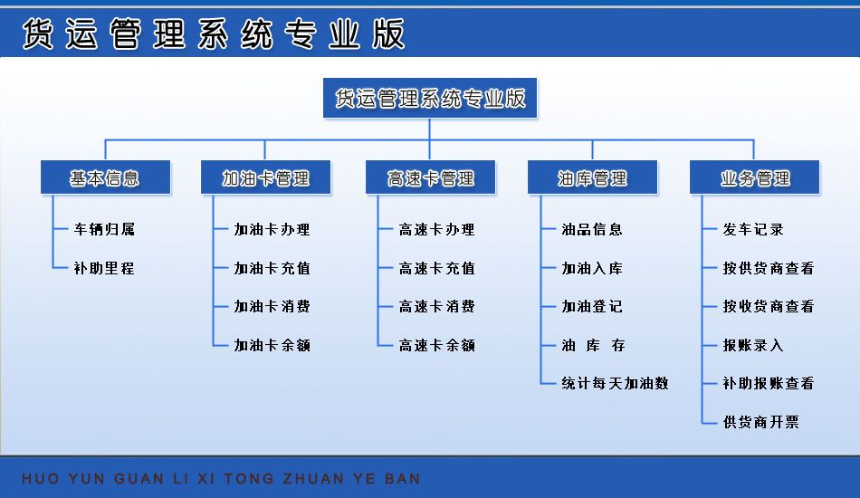 《货运管理系统专业版》是专门为货运公司开发的一款管理软件。该系统主要包含基本信息、加油卡管理、高速卡管理、油库管理、业务管理五大模块,信息录入详细,查询功能强大,让您操作简便、提高工作效率! 系统包含以下五大部分: 1.基本信息:车辆归属、补助里程; 2.加油卡管理:加油卡办理、加油卡充值、加油卡消费、加油卡余额; 3.高速卡管理:高速卡办理、高速卡充值、高速卡消费、高速卡余额; 4.油库管理:油品信息、加油入库、加油登记、油库存、统计每天加油数; 3.业务管理:发车记录、按供货商查看、按收货商查看、报账录入、补助报账查看、供货商开票。