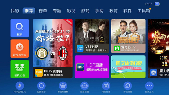 遵循 Android TV 规范设计的沙发管家V5 采用了横排布局,卡片式图标管理充分发挥电视屏幕大和颜色靓丽的特点,结合专业设计团队制作的精美图标,沙发管家V5 的主界面更加简约、有序,又生动。