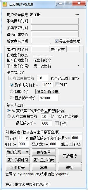 4、按【开始运行】云云上方界面会显示拍卖倒计时,说明正常运行。软件最下方提示拍卖客户端正在运行。