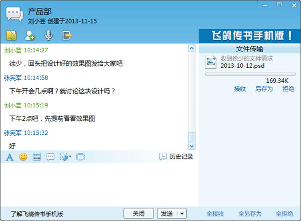 讨论组模块也在飞鸽传书2014版中做了很多改进,已经完全支持讨论组的消息和文件收发,并且可以随时查看消息和文件的收发记录。