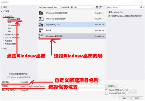 3、在新建项目页面展开Visual c++,选择Windows桌面,之后在右侧选择Windows桌面向导(可以自定义项目名称,以及更改新建项目的保存位置)