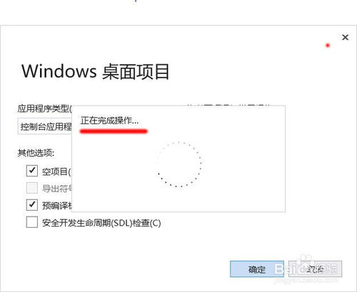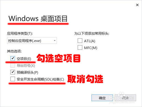 4、Windows桌面项目界面下,勾选空项目,将安全生命开发周期(SDL)检查取消勾选