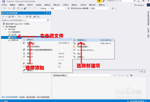 7、在项目目录下,右击源文件,在弹出的菜单中选择添加,再点击新建项