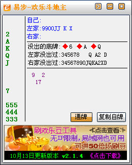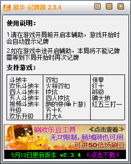 易步qq记牌器是一款各类QQ牌类游戏的记牌软件,该软件纯绿色无须安装,完全免费,帮你记住所有打过的牌。qq记牌器下载支持QQ斗地主、QQ欢乐斗地主、QQ双扣、QQ火拼双扣、QQ挖坑等众多游戏,游戏开局前开启本辅助,游戏开始时会自动显示记牌。