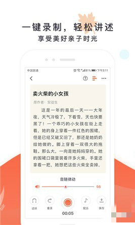 4、配乐录制:7大类近百首专业故事配乐,不同故事配不同配乐,录制一键合成,一键分享;