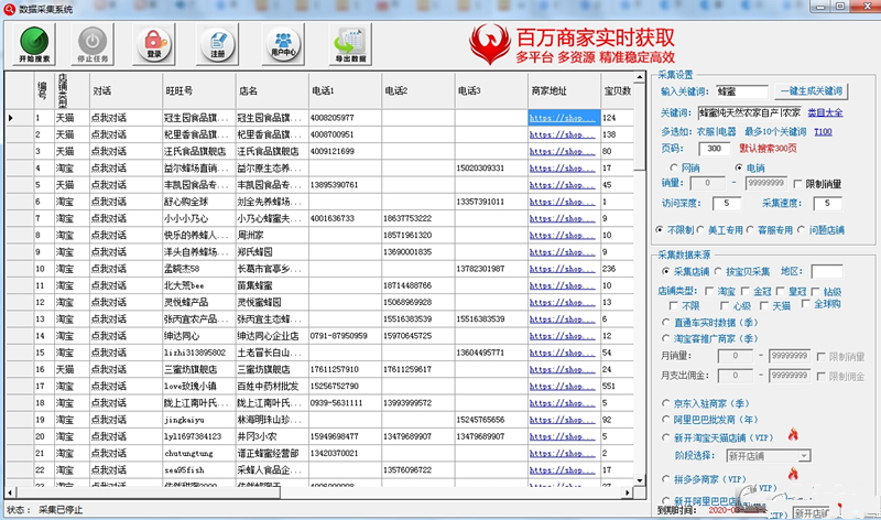 1、操作简单,搜索速度快。(本软件使用云采集技术,10分钟即可采集实时更新数据1000条以上,最多比市面上其他软件快20倍!)2、软件可以采集到店铺名称、旺旺名、电话号码、手机号码、QQ号码、微信、销量、评价数、好评率等。
