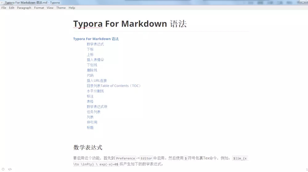 要启用这个功能,首先到Preference->Editor中启用。然后使用$符号包裹Tex命令,例如:$lim_{x \to \infty} \ exp(-x)=0$将产生如下的数学表达式: