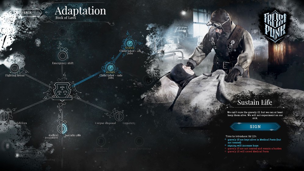 与同厂“师兄” 《这是我的战争》(This War of Mine)与《冰汽时代》(Frostpunk)相同之处在于,这都是一段悲剧的故事,整个游戏的走向在于玩家的一次次选择——向左或向右,激进或保守,这些决定往往左右着最终的结局,不同的是,前者是玩家扮演的一个人物的抉择,后者是作为一个团体领导的抉择。