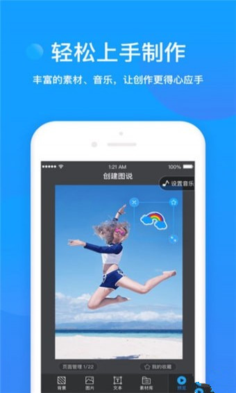 * 海量精品模板供你选择,无论你需要的是图集、语录、相册、贺卡、邀请函,音乐图说应有尽有,一应俱全。* 强大的编辑功能,换背景,换图片,改文字,加音乐,动起来,超丰富的编辑功能满足你的专属定制。