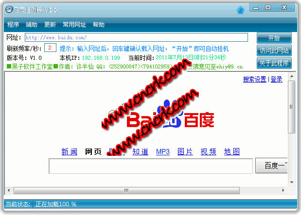 网页挂时器 V1.1 简体中文绿色免费版 您是否看到论坛中的高等级账号而十分羡慕?您是否面对搜索达人而自叹不如?您是否面对腾讯搜搜的qb奖励而望之莫及?没精力,没时间,不想拼命地刷新来增加在线时间,增加等级?那好,有了网页挂时器这款软件,您就只要打开网页挂时器软件,就可以轻松刷网页,挂论坛,让别人羡慕您的等级,让腾讯把qb白送给您!网页挂时器是您上网必不可少的广告防护利器,您不妨试用。