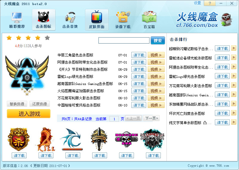 CF766火线魔盒是一款集图标下载、喷图、视频、资讯、加速、音效、换肤于一体的游戏工具,该软件可以让广大cf玩家带来诸多福利。带来无限的游戏乐趣。该软件由专门的团队负责软件更新和运行维护,保证广大玩家的便利。本软件测试期间出现的一切杀软危险提示均为误报。