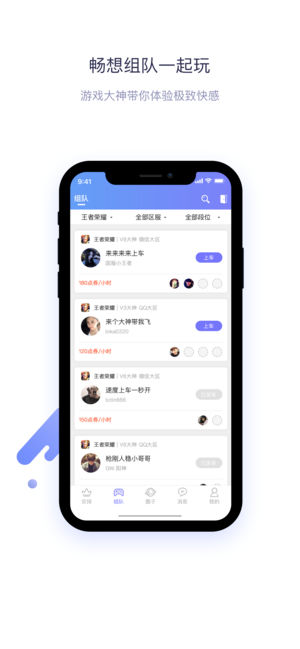 您可以在组队列表中筛选自己想玩的游戏,加入房间后与大神开始沟通并在支付点券后与大神一起开始一场游戏。