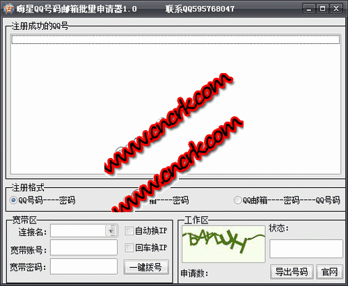 能同时申请邮箱和qq号码 自动生成qq邮箱,随机密码 智能识别ip是否被封,自动切换ip 注册工程只需要输入一次验证码即可