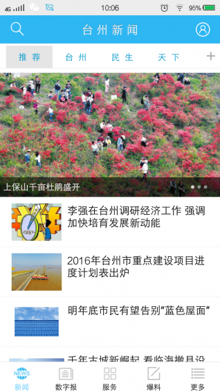 台州新闻App集纳台州日报报业传媒集团台州日报、台州晚报、台州商报、中国台州网、台州手机报等优质资源,新构架新闻服务、生活服务、政民互动、爆料系统、论坛互动等互动功能定位,以便捷的游览方式、强大的应用功能,最新的资讯信息为台州用户提供了一个系统、全面、一站式的移动端应用平台。