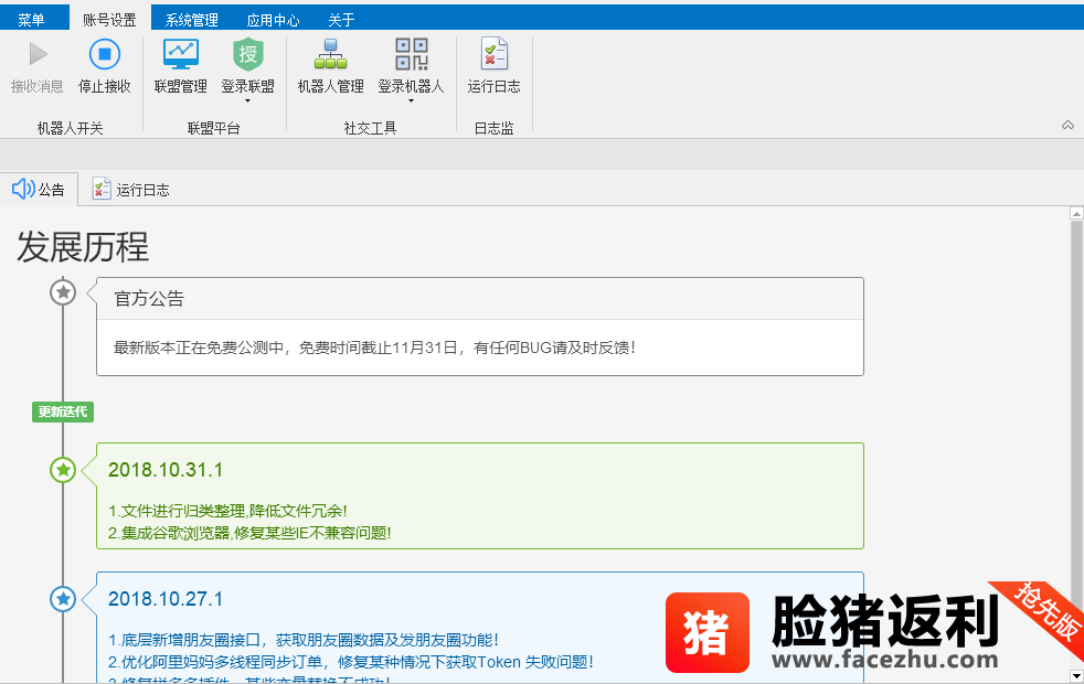 脸猪返利机器人是一款为微商和淘宝店主提供的推广工具,这款软件能够进行自动返利,通过对脸猪返利机器人进行设置,你就可以为所有的客户提供返利优惠,从而打响自己的店铺名气。
