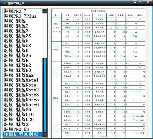 有不少小伙伴并不知道自己的魅族手机型号,这款魅族机型工具就可以让你细心对比图片和自己手机是否一致,若无法确定机型也可对比软件内的机型对照表。确认了手机型号之后,搜索对应机型刷机资料,下载资料,细心看教程,然后就可以开始刷机了。【使用方法】