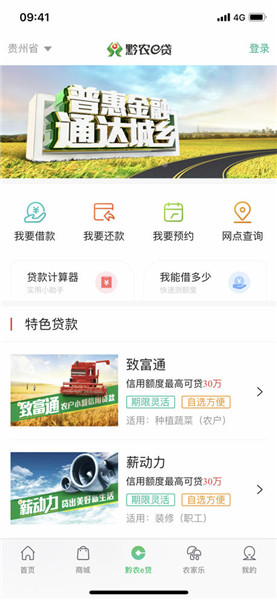 黔农云app融合黔农e贷,支持线上贷款、自助还款、预约贷款等功能。