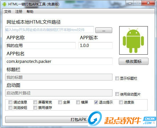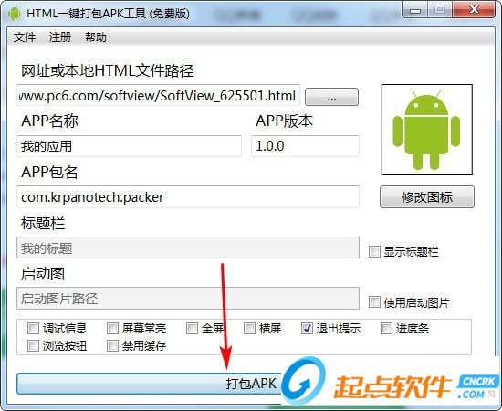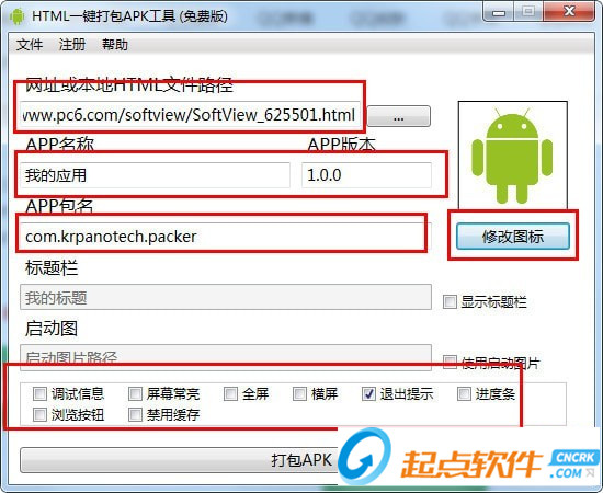 3.支持自定义图标,自定义APP名称,自定义包名,全屏,横屏,退出提示,保持常亮等选项