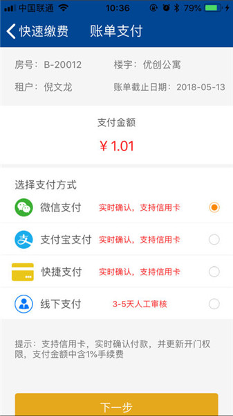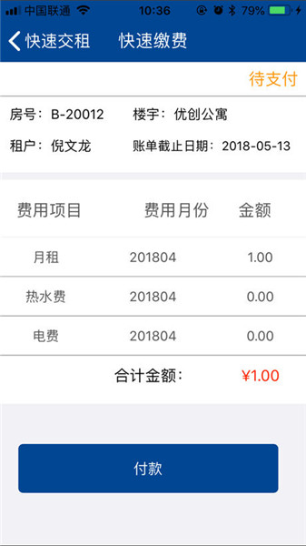 1、租客可使用App进行房租查询,交租