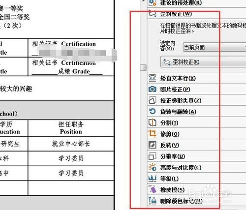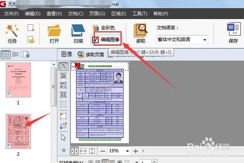 四、对识别的图像等结果进行手动编辑。如歪斜矫正、对比度调节等,使结果效果更好。选中某一页后,上方点击编辑图像,即可进入编辑页面,对具体内容进行调整。