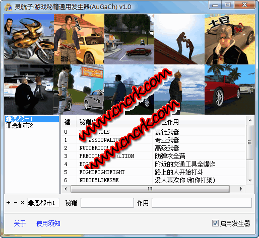 以前玩很多支持秘籍的游戏如《侠盗猎车手·罪恶都市》时,都需要手动一个字母一个字母的输入,这样首先是操作上不方便,其次是对于不谙英语或即时记忆能力差的人而言还是多少有些应用上的制约的。——故此,本人特别编写了这个小工具,它可以模拟按下秘籍的英文内容,产生跟真人实际按下的效果,只需一个指定键,就可以把任何长度的秘籍瞬间模拟出来,即刻生效...